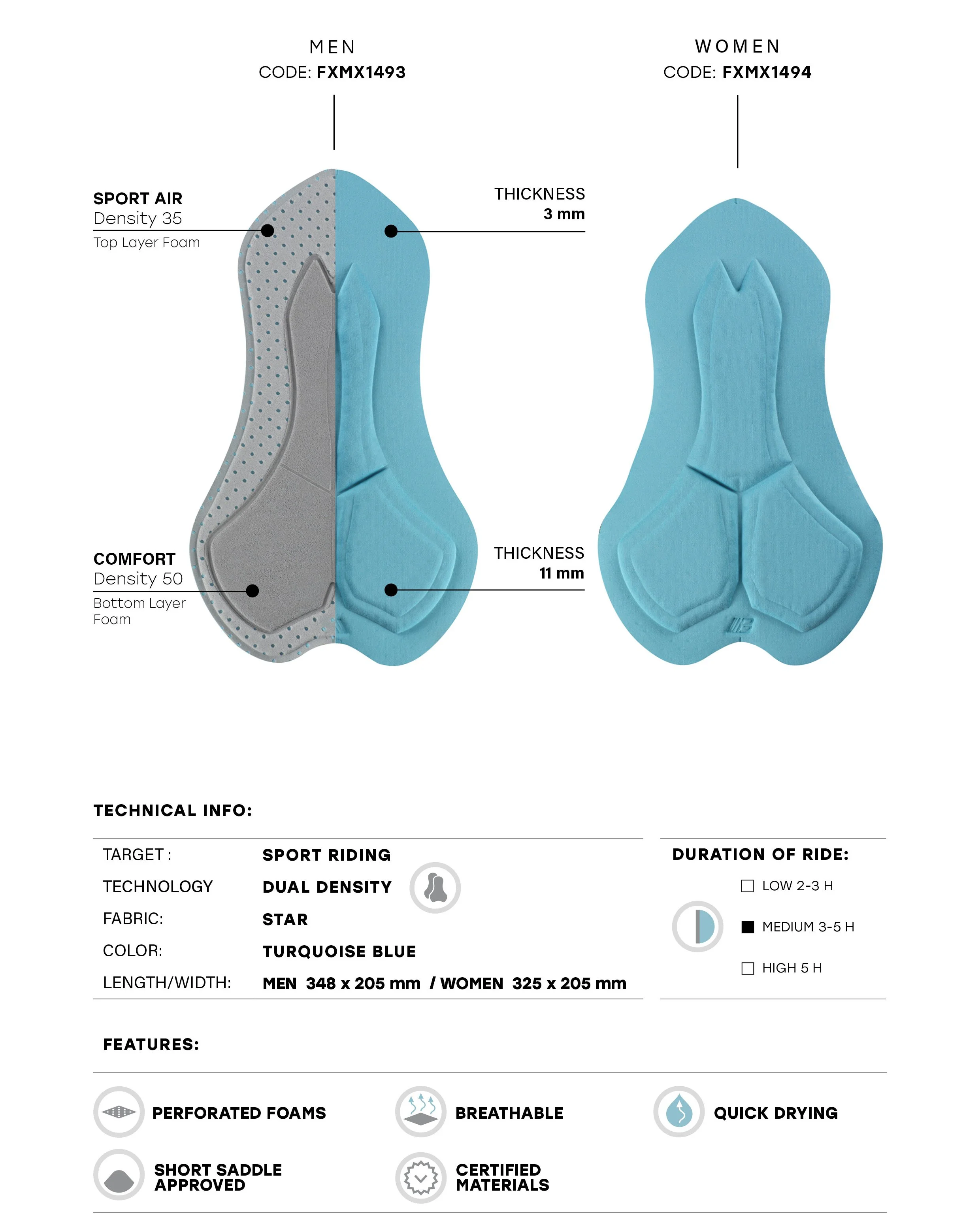 Dual Density elastic pad. Hi-Density foam inserts located in the main pressure points for real satisfactory protection for rides over 3 hours. New design for better freedom of movement and protection while pedaling. Air flow system to provide better breathability. Smooth transition between foam levels to avoid chafing problems.